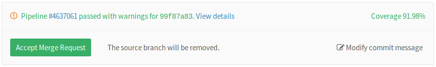 If the pipeline succeeds, the coverage is shown in the merge request widget and in the jobs table.